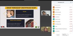 Metro, metrouniv.ac.id — Fakultas Tarbiyah dan Ilmu Keguruan (FTIK) UIN Jurai Siwo Lampung menggelar kegiatan Desiminasi Pemahaman dan Pengendalian Gratifikasi, Rabu (30/7), secara daring melalui Zoom Meeting. Kegiatan ini diikuti oleh seluruh jajaran pimpinan, dosen, serta tenaga kependidikan FTIK, sebagai bagian dari upaya memperkuat budaya integritas dan mencegah praktik korupsi di lingkungan kampus.