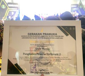 Bandar Lampung, metrouniv.ac.id, – IAIN Metro Lampung berhasil meraih Piagam Penghargaan sebagai Pangkalan Peserta Terfavorit 2 dalam ajang Perkemahan Songsong Ramadhan (PSR) Tingkat Nasional ke-34 yang diselenggarakan oleh Universitas Islam Negeri Raden Intan Lampung (UIN RIL) pada 17-21 Februari 2024. Penganugerahan piagam penghargaan ini berlangsung pada malam puncak Rimbaku Trisila di Ballroom UIN RIL Lampung, Jumat (21/02/2025).