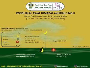 “Jika kondisi langit cerah dan hamburan cahaya syafaq tidak mendominasi di langit bagian Barat, hilal sebagai penentu pergantian awal bulan Rabiul Akhir 1446 H, dimungkinkan dapat diamati dengan kasat mata maupun dengan bantuan alat optik seperti theodolit atau teleskop, karena ketinggian hilal sudah berada pada posisi 12 derajat dan sudah memenuhi ambang batas dari kriteria MABIMS dengan batas minimal terlihatnya hilal yaitu 3 derajat, sudut elongasi 6,4 derajat”, ujar Sakirman sebagai dosen pendamping,