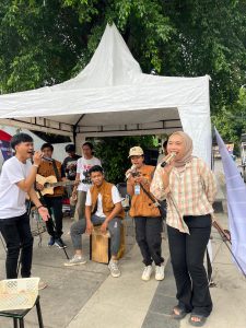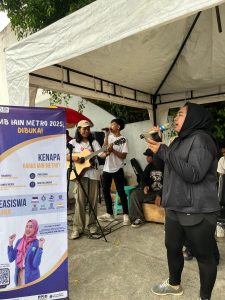 Metro, metrouniv.ac.id – Mahasiswa IAIN Metro yang tergabung dalam Unit Kegiatan Mahasiswa (UKM) Ikatan Mahasiswa Pencinta Seni (IMPAS) tampil memukau dengan pertunjukan musik akustik pada kegiatan rutin Bazar UMKM Pojok BSI, Minggu (1/2/2024).