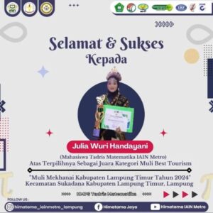 Selain itu pada Ajang pemilihan muli mekhanai lampung timur 2024, yang di laksanakan dari tanggal 20 April sampai dengan tanggal 26 April 2024, Mahasiswa IAIN atas nama Julia Wuri Handayani, dari Tadris Matematika mampu menempatkan dirinya sebagai Muli Best Tourism. Acara penganugerahan tersebut dilangsungkan pada malam Grand Final, bertempat di kantor dinas bupati, Sukadana lampung timur. (humas/Lk)