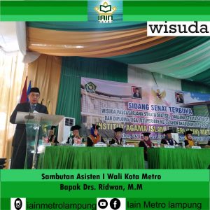 Metro – metrouniv.ac.id – Drs.Ridwan, M.M, Asisten I Wali Kota Metro mewakili Wali Kota Metro menghadiri acara wisuda periode II tahun akademik 2019/2020 untuk menyampaikan