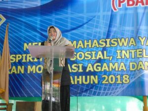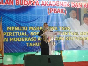 Metro, Metrouniv.ac.id- Dr ida Umami, M.Pd. Kons menyampaikan surat edaran dari Kementerian Agama kepada mahasiswa baru IAIN Metro yang sedang melaksanakan kegiatan PBAK di halaman