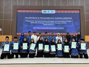Banjarejo, metrouniv.ac.id – Sebanyak 11 pegawai Universitas Islam Negeri (UIN) Jurai Siwo Lampung resmi dilantik sebagai Aparatur Sipil Negara (ASN) melalui jalur Pegawai Pemerintah dengan Perjanjian Kerja (PPPK) tahap I tahun 2024. Pelantikan dan pengambilan sumpah jabatan ini dilaksanakan secara daring dari Gedung Academic Centre Kampus II UIN Jurai Siwo, yang sebelumnya bernama IAIN Metro. Prosesi berlangsung khidmat, diikuti oleh 11 peserta yang terdiri atas tujuh dosen dan empat tenaga kependidikan (tendik).
