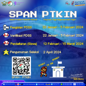 Metro, metrouniv.ac.id. – Pelaksanaan Penerimaan Mahasiswa Baru (PMB) melalui jalur SPAN-PTKIN (Seleksi Prestasi Akademik Nasional – Perguruan Tinggi Keagamaan Islam Negeri) telah dimulai (Selasa-22/01/2023), sebanyak 528 kuota penerimaan mahasiswa baru disiapkan oleh IAIN Metro melalui jalur ini.