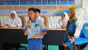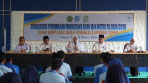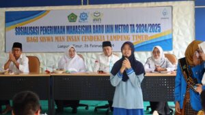 Lampung Timur, metrouniv.ac.id – Berbagai upaya untuk mengenalkan lebih dalam tentang kampus IAIN Metro telah dilakukan oleh seluruh sivitas akademika. Rektor IAIN Metro, Prof. Dr. Hj. Siti Nurjanah, M.Ag., PAI secara lagsung memimpin kegiatan sosialisasi sebagai upaya tersebut di MAN (Madrasah Aliyah Negeri) Insan Cendikia Lampung Timur (Senin-26/02/2024) kepada para siswa sekolah tersebut