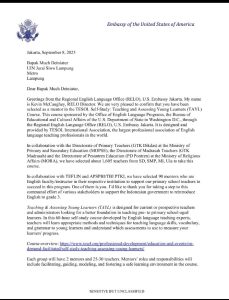 Partisipasi Much Deiniatur dalam program ini bukan hanya menjadi prestasi individual, tetapi juga representasi dari komitmen UIN Jurai Siwo Lampung, khususnya Prodi TBI, dalam mendukung upaya peningkatan kualitas pendidikan Bahasa Inggris di Indonesia melalui kolaborasi global.