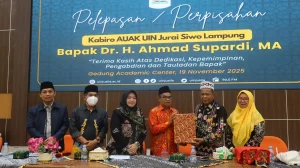 Lampung, metrouniv.ac.id — Suasana penuh kehangatan, keakraban, dan haru menyelimuti acara pelepasan Ahmad Supardi yang resmi mengakhiri masa jabatannya sebagai Kepala Biro Administrasi Umum, Akademik, dan Kemahasiswaan (AUAK) UIN Jurai Siwo Lampung. Acara tersebut berlangsung di Aula Gedung Akademik Center (GAC) Kampus II UIN Jurai Siwo Lampung pada Rabu (19/11/2025).