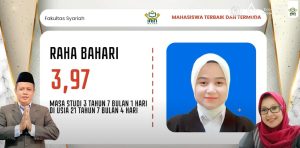 Setelah sambutan, acara dilanjutkan dengan pemberian penghargaan kepada mahasiswa berprestasi. Raha Bahari dari Program Studi Hukum Ekonomi Syariah menjadi mahasiswa terbaik dan termuda dengan IPK 3.97 dengan usia 20 Tahun, 3 bulan 5 hari. Sementara itu, Muhammad Zidan dari Program Studi Hukum Ekonomi Syariah berhasil menjadi mahasiswa tercepat dengan masa studi 3 tahun 2 bulan dan IPK 3.89.