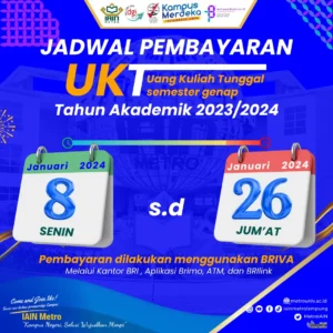 Metro, metrouniv.ac.id. – PengumumanMasa Pembayaran Uang Kuliah Tunggal (UKT) Semester Genap Tahun Akademik 2003/2004, nomor: 0131/In.28/B3/HM.00/01/2024 8 Januari 2024, Perihal Pengumuman selengkaopnya (UNDUH DISINI)